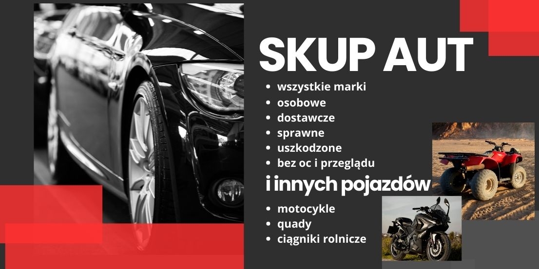 Prowadzimy profesjonalny skup samochodów osobowych oraz dostawczych – sprawnych, uszkodzonych, powypadkowych, z problemami technicznymi, bez ważnego przeglądu czy ubezpieczenia OC oraz innych pojazdów takich jak quady, motocykle czy ciągniki. Działamy szybko, uczciwie i bez zbędnych formalności. Oferujemy odbiór 24/7, płatność gotówką od ręki tego samego dnia oraz transport lawetą na nasz koszt. Działamy legalnie, wystawiamy umowę i gwarantujemy przejrzyste warunki współpracy.